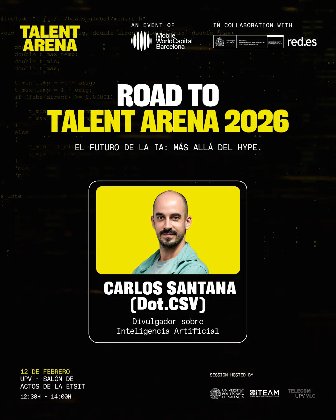 El próximo 12 de febrero, de 12:30 a 14:00, Mobile World Capital Barcelona y la Secretaría de Estado de Digitalización e Inteligencia Artificial presentarán Talent Arena 26. El evento contará además con uno de los speakersya confirmados para esta edición: Carlos Santana (Dot CSV), AI Communicator en YouTube, que ofrecerá la charla “El futuro de la IA: Más allá del hype”.