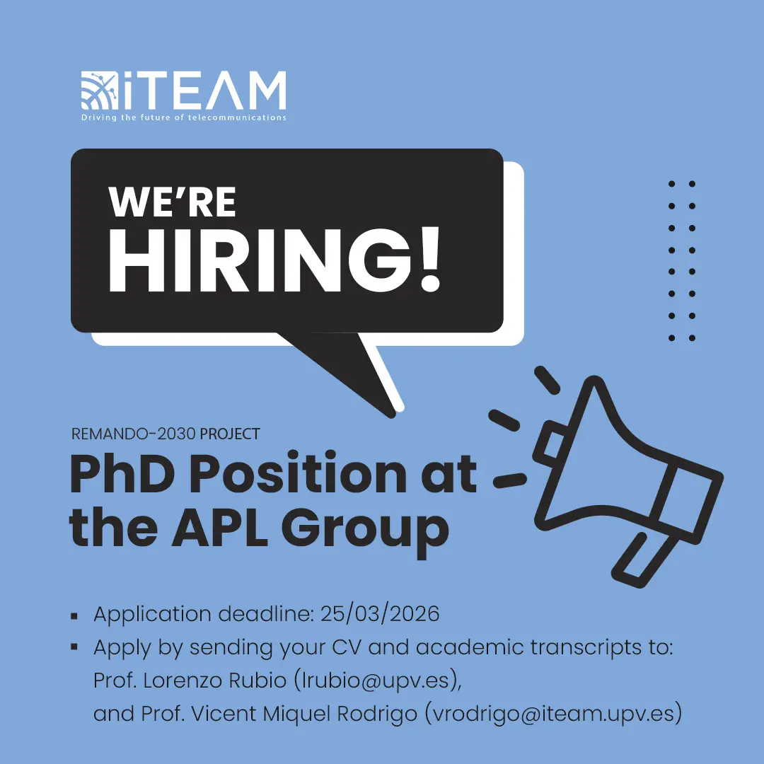 The Antennas and Propagation Lab (APL) at the iTEAM Research Institute of the Universitat Politècnica de València (UPV) is offering a fully funded 4-year PhD position within the REMANDO-2030 project, focused on advanced radio channel measurements and modeling for future IMT-2030 wireless systems. This is an excellent opportunity to join a strong research environment working at the frontier of radio propagation, channel characterization, wireless communications, and advanced modeling techniques for next-generation networks.