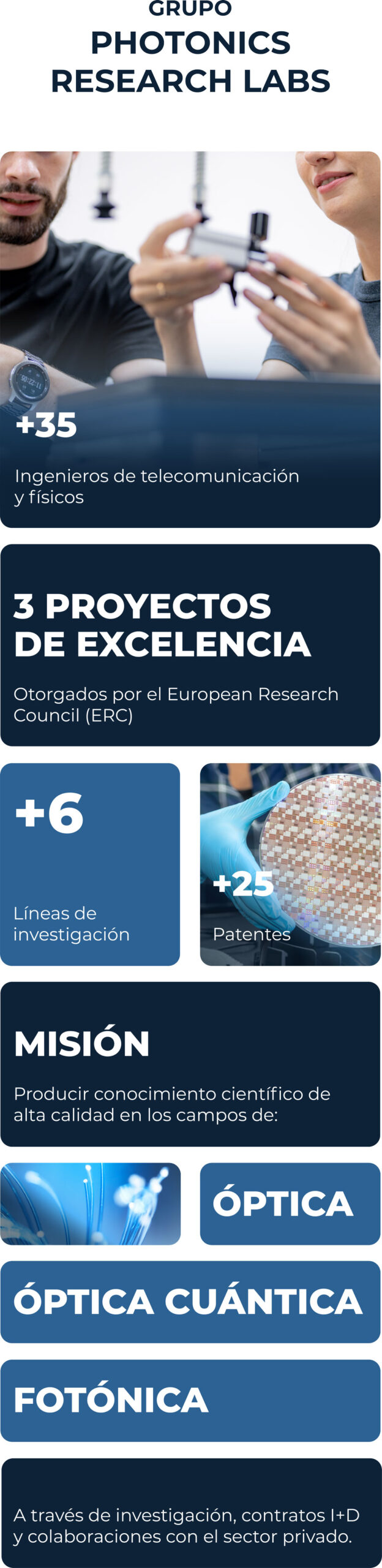El Photonics Research Labs (PRL) están formados actualmente por alrededor de 40 ingenieros de telecomunicación y físicos. La misión del PRL es producir conocimiento científico de alta calidad en el campo de la óptica, óptica cuántica y la fotónica, a través de proyectos de investigación, contratos de I+D y acuerdos de colaboración con el sector privado. Su actividad de investigación se centra en varias aplicaciones de la fotónica, principalmente en las comunicaciones ópticas de señales analógicas y digitales, sistemas de radio sobre fibra y circuitos integrados fotónicos. Parte de la investigación también se lleva a cabo en el campo de sensor de fibra óptica y la fotónica industrial. Entre otros, los PRL cuentan en la actualidad con tres Proyectos de Excelencia otorgados por el European Research Council (ERC). |